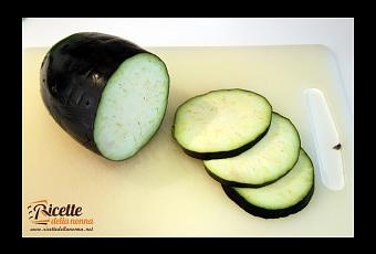 Prendete una melanzana e tagliatela nel senso della larghezza in tanti dischi di circa mezzo centimetro.