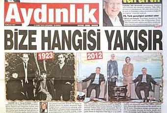 Un quotidiano laicista ha pubblicato questa prima pagina, in cui vengono messe a confronto una foto del presidente e del primo ministro della Repubblica di Turchia – con rispettive consorti – nel 1923 e nel 2012. Nella prima gli uomini portano la cravatta e sono in piedi, le donne sedute; nella seconda gli uomini non hanno la ravatta e sono seduti, le donne in piedi. Come dire: ma come ci siamo ridotti? La foto del 2012, di pochi giorni fa, è stata scattata durante un visita di cortesia del presidente Gül al premier Erdoğan, ancora convalescente, nella sua residenza privata. Non sarebbe stato più onesto tenerlo in considerazione?