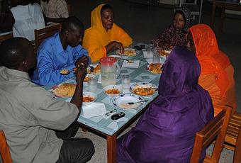 In alto famiglie musulmane in tranquilla conversazione all'ora di pranzo (foto di Francesco Bernardi)
