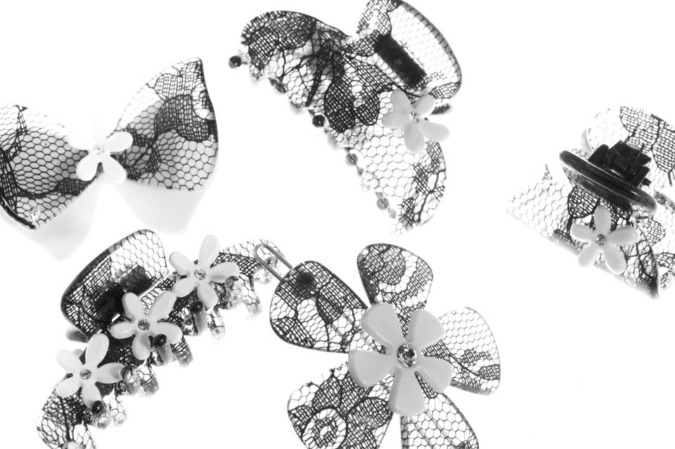 Lace Collection, pizzo nero arricchito da fiori bianchi a contrasto, per questa collezione di pinzoni e fermagli che arricchiscono un look casual.