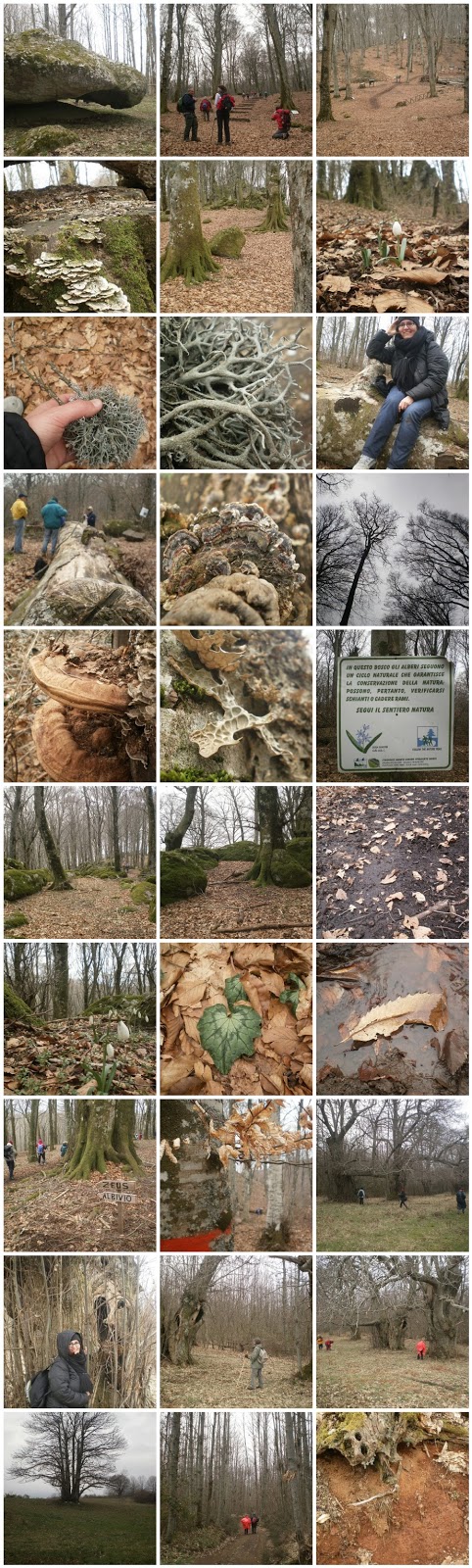 La faggeta era, ovviamente, bellissima, maestosa e magica, ancora intirizzita dal freddo e spoglia, ma piena di bucaneve e ciclamini pronti a sfidare il clima, ai bordi di un sentiero di terra nera; più avanti antichissimi castagni, in gruppo o solitari, le cui buie cavità erano chiaramente dimora di streghe e chissà chi altro. Ancora scendendo, boschi di castagni più giovani, alti e diritti verso il cielo, con le radici affondate in una terra molto rossa e i cui tronchi e rami mossi dal vento gelido battevano in alto fra di loro suonando ritmi segreti.