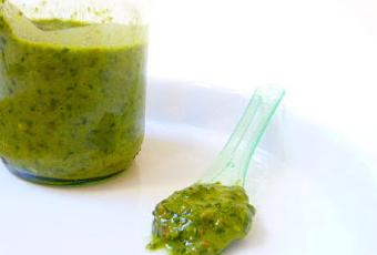 Frulliamo un mazzetto di prezzemolo, uno di coriandolo, tre spicchi di aglio, un cucchiaino di paprika e uno di cumino, se vogliamo un peperoncino, il succo di un limone, sale, pepe nero macinato fresco e un qualche cucchiaio di olio evo.