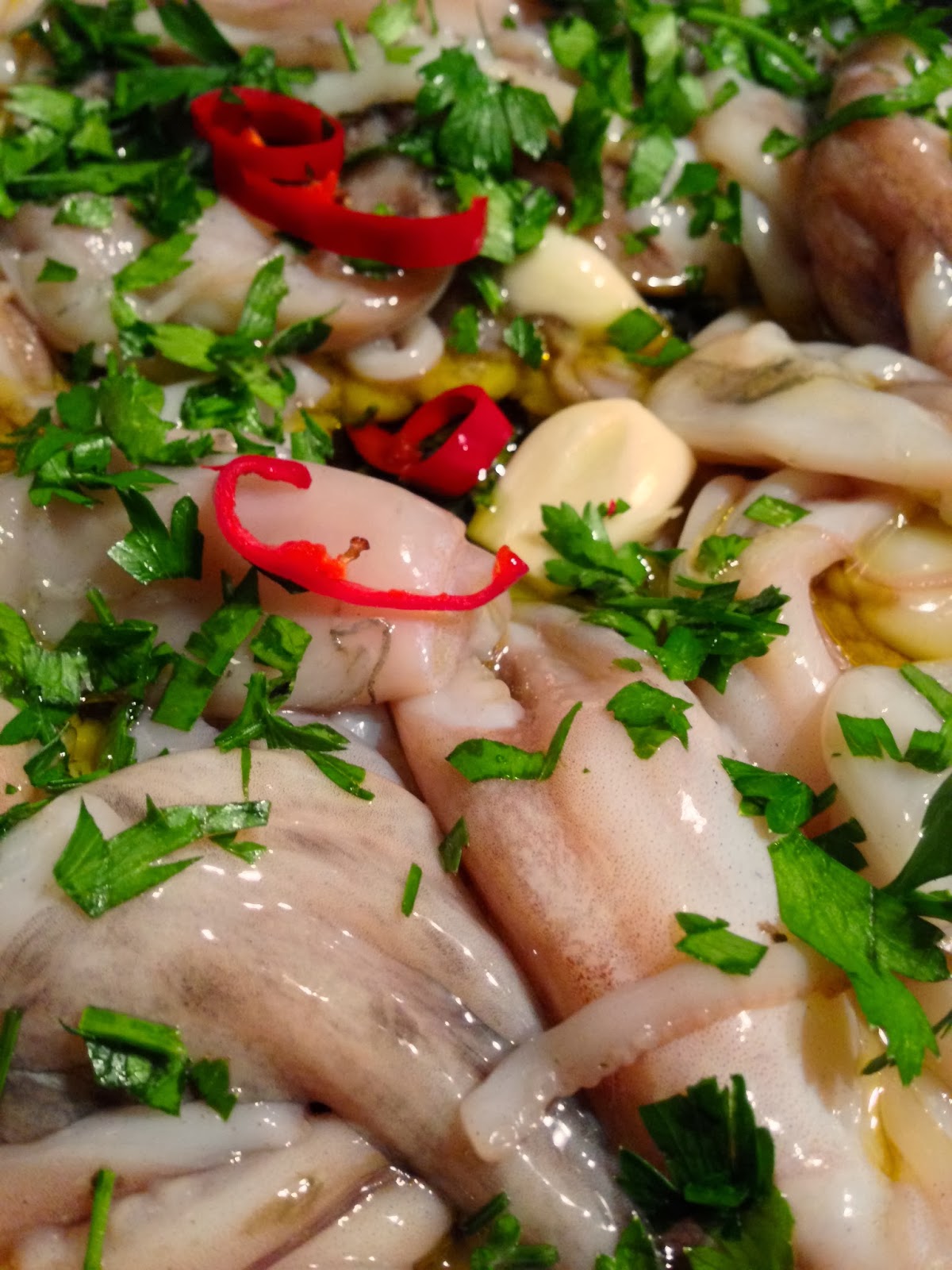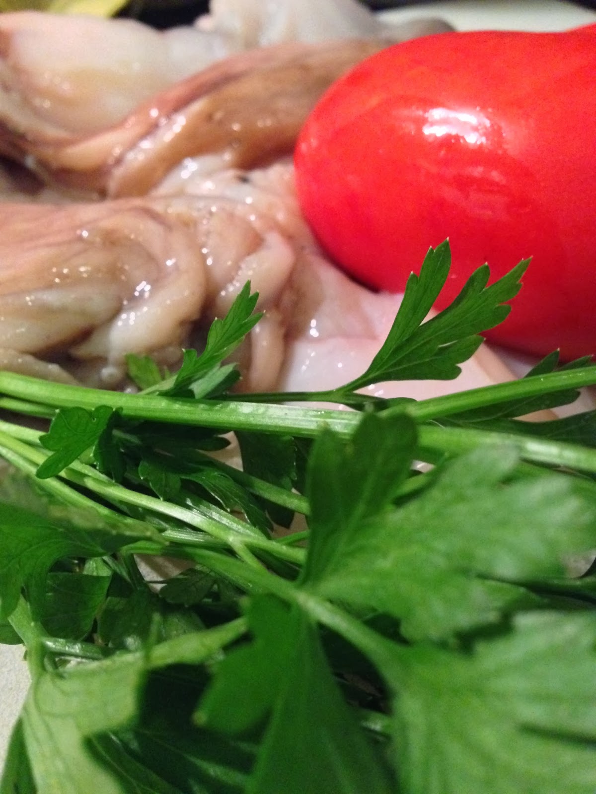 Thoroughly clean the octopus (if they are big cut them into pieces), chop the parsley and dice ripe tomatoes, peel 2 garlic cloves.
