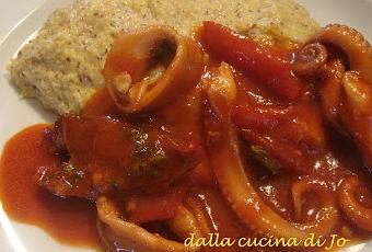 Servo un po' di polenta e moscardini, bagno con un po' di salsa, spolvero di pepe e porto in tavola.