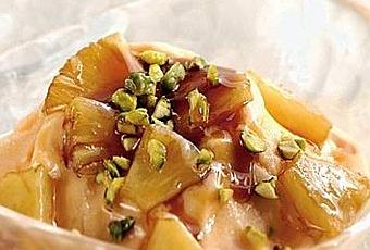 - Distribuite il gelato al mango in coppette individuali, versatevi sopra l’ananas con la sua marinata e cospargete con i pistacchi tritati.