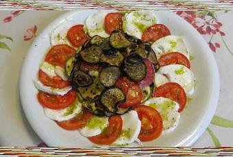 Una caprese arricchita di sottili fettine di verdure in padella, ovvero una bella insalata da gustare in questi ultimi giorni di estate.