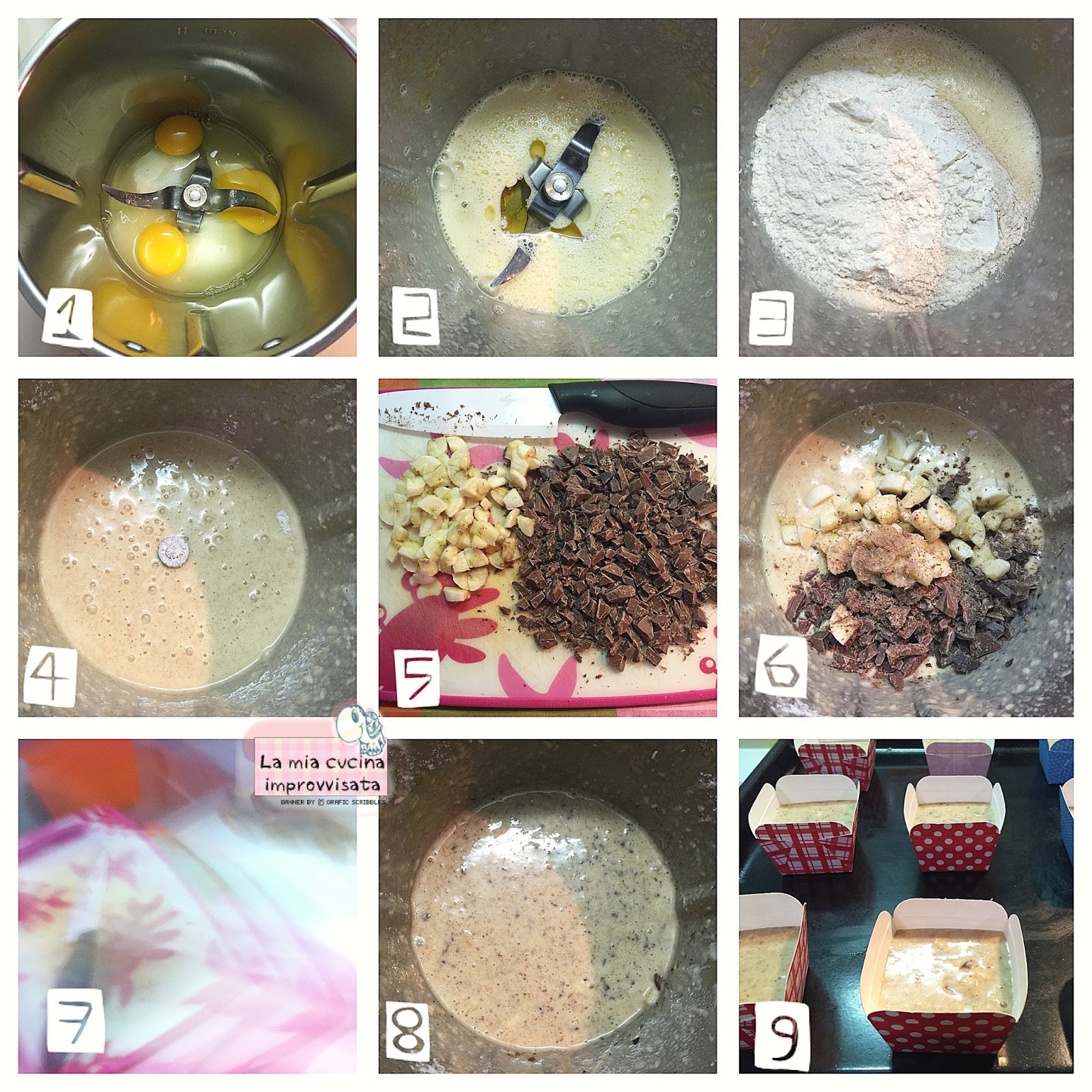 (FIG.1): Per prima cosa ho messo nel boccale le uova e lo zucchero e le ho sbattute o meglio frullate (1min.vel.4-5) (FIG.2): Ho aggiunto l'olio e il latte ed ho amalgamato il tutto (30sec.vel.4-5)(FIG.3 e 4): Ho versato le farine 00, di farro e di cocco e il lievito ed ho amalgamato il tutto (1 min.vel.4-5)(FIG.5 e 6): A questo punto ho tagliato col coltello la banana a tocchetti e il cioccolato a scaglie grossolane e ho versato tutto sul boccale, non resta che mescolare.(FIG.7): Ero pronta per fare la foto del tutorial quando il telefono per un pelo non mi cade dentro l'impasto, per fortuna l'ho acchiappato all'ultimo.(FIG.8): Ho mescolato delicatamente in modo da unire gli ultimi ingredienti all'impasto (7sec.antiorario vel.2)(FIG.9): Ho riempito i pirottini di cartoncino colorato e li ho infornati a 170° per 35 minuti circa, in forno preriscaldato ventilato.