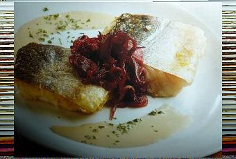 servite le scaloppine di pesce con le cipolle in agrodolce e la salsa di mandorle