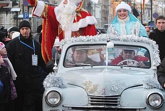 Babbo Natale a San Pietroburgo, su auto d'epoca