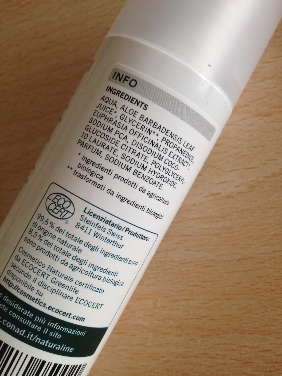 Infine, lo Struccante Occhi all'Aloe vera ed Eufrasia. Flacone da 100ml -comodo in viaggio, è liquido e trasparente come un'acqua, è veramente delicato e non mi brucia assolutamente gli occhi..trovo, però, che non mi strucchi bene il mascara -che in questo periodo è tra le poche cose che uso- e devo ricorrere a struccare anche con del latte detergente dopo, quindi per questo non penso lo riacquisterei..per la rimozione di matite, ombretti e quant'altro, invece, niente da ridire. Tra l'altro è scritto chiaramente che non è indicato per trucchi waterproof.