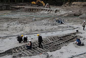 I resti di una delle imbarcazioni scoperte durante la costruzione di un edificio residenziale a Tallin, Estonia