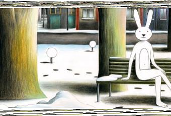 Le tavole sono sviluppate attraverso l’uso alternato di volumi di colore scuro e di colore chiaro: le facciate dei palazzi, certi sfondi ed il Grande Buio contrastano con la neve, le finestre illuminate ed il coniglio. Le due creature, per via del destino che le accomuna, sembrano farsi parodia.