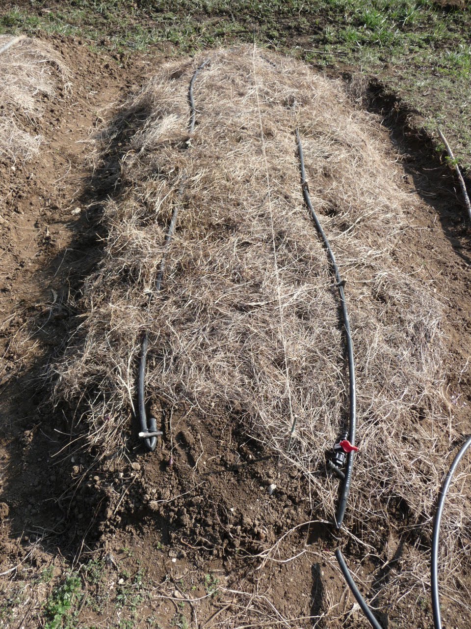 Seguendo le indicazioni per realizzare il nostro orto sinergico e con l'aiuto dell'esperienza di Nonno Urbano abbiamo poggiato dei tubi in polietilene (diam.16) sulle nostre aiuole a circuito chiuso.Dotati di un rubinetto per la regolazione della pressione dell'acqua.Io ho poi forato il tubo con un chiodino ( circa 1.5-2mm di diam), la distanza tra un forellino e l'altro "ad occhio" 20-30cm.Ogni circuito di ciascuna aiuola si rifornisce poi dal tubo principale che passa in testa alle aiuole.