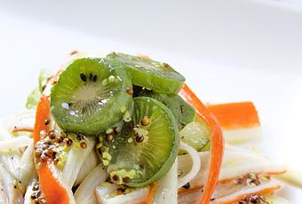 - Tagliare a fette i Nergi e comporre l'insalata: mela, Nergi a fette, polpa di granchio o surimi a striscioline e l'emulsione alla senape in grani.