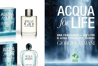A partire dal 1 marzo, ogni bottiglia venduta di Acqua di Giò e di Acqua di Gioia, due della fragranze della maison Giorgio Armani, genererà la donazione di 100 litri di acqua potabile all'anno per alcune comunità africane che ancora non hanno un pozzo a cui attingerla: si comincia con 15 villaggi in Ghana dove verranno realizzati, entro Natale, altrettanti sistemi di raccolta d'acqua in grado di supplire alle necessità delle popolazioni locali per 15 anni. Per arrivare ai 40 milioni di litri, fino al 31 maggio, la sfida passa sul Web, dove chi acquista può incrementare la donazione inserendo un codice personale indicato sulla confezione del profumo sul sito http://www.acquaforlifechallenge.org/ Non solo. Ulteriori quanttà d'acqua verranno donate creando community su Facebook (www.facebook.com/acquaforlife) con i commenti e i "Mi piace" degli utenti, in una sorta di sfida a quale gruppo raccoglie più litri.