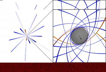 Simulazioni relative ad una serie di traiettorie per una coda mareale attorno a un buco. La precessione relativistica fa sì che la coda mareale si avvolga 13 volte attorno al buco nero prima di collidere con sè stessa. Credit: Guillochon&Ramirez-Ruiz 2015