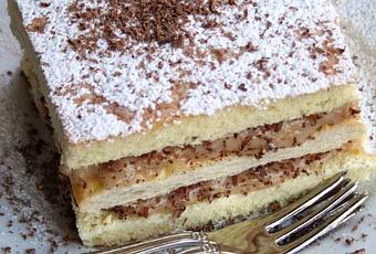Montiamo il dolce: adagiamo nel piatto il primo strato di pan di spagna, bagnamolo con un po' di latte, quindi spalmiamo uno strato di crema, diamo una grattugiata di cioccolato fondente, appoggiamo lo strato di sfoglia, quindi il secondo strato di crema, un'altra grattugiata di cioccolato e infine chiudiamo con pan di spagna.