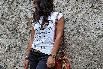 Questa è la storia della scoperta della medicina. La mia. Quella che se sei nervosa o scocciata prendi una maglia la indossi e da quello che c'è scritto si capisce il mood del giorno. Pollon cantava: sembra talco ma non è, serve a darti l'allegria. Io dico che l'allegria a volte può arrivare anche da una maglia con su delle perle di saggezza. In questo caso le perle di Pinna per Happiness. Frasi ad effetto, a tratti caustiche spesso ironiche. Scritte impresse su una t-shirt che dicono esattamente quello che pensi. Lo urlano. Tu sei zitta e loro parlano per te. Delle t-shirt incriminate ve ne avevo già parlato. Ecco la prova. Fatto sta che dopo la prima è arrivata anche la seconda e la terza. Perché ci sono certe medicine di cui non puoi fare a meno. Creano l'effetto "placebo"... ovvero basta l'atteggiamento positivo ad indurre un effetto curativo.Metafore a parte ecco il mio look con un happiness tee per la serie Ornella in Happilandia. In jeans&flat. Con un sorriso stampato sulla faccia. E una borsa vintage che con la sua forma a secchiello mi ricorda la Noè di LV, senza stampa monogram (ahimè).