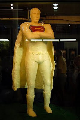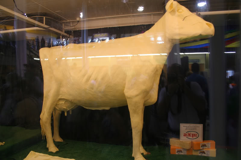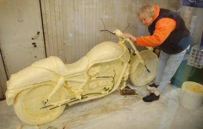 MARSHALLTOWN, IOWA, USA - Eh sì, ormai l'abbiamo capito, la gente fa cose strane (tipo infilarsi tabacco nel naso) e Duffy Lyon, soprannominata The Butter Cow Lady, non era certo da meno. La sua passione era fare sculture di burro. Eh già, burro. Non so che cazzo di senso abbia, comunque pare che sia una tradizione della Fiera di Stato dell'Iowa, dove ogni anno (dal 1911!) diversi villici si cimentano nella creazione di sculture di mucche di burro (solitamente di dimensioni ridotte). Poi nel 1961 arrivò Duffy Lyon e non ci fu più partita, dato che iniziò a realizzare enormi vacche di burro, e fu così che guadagnò il suo soprannome, la Signora Vacca di Burro. Pensate, per fare un bovino come quello in foto ci vogliono 270 kg di burro, con i quali si potrebbero imburrare 19.200 toast (non voglio neanche sapere come hanno fatto questo calcolo).Col tempo iniziò a variare il soggetto: dopo aver scolpito tutte le razze di mucche che conosceva, produsse statue burrose di Elvis, Obama, Tiger Woods (con tanto di tigre), Superman, una Harley e persino l'ultima cena, con cristi e apostoli assortiti (chissà se ha messo il canguro).