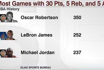 Da quando è sbarcato nella Lega, LeBron James ha già siglato 252 partite con almeno 30 punti, 5 rimbalzi e 5 assist, primo assoluto da allora. Il secondo, Kobe Bryant, segue ad appena 123 partite. Soltanto Oscar Robertson ha fatto meglio di lui in carriera, con 350 partite da almeno 30+5+5. Il Prescelto guida i Cavaliers al successo contro i Jazz con ben 15 punti negli ultimi 8 minuti del quarto periodo, quasi quanti ne aveva segnati nei restanti 40 (16).