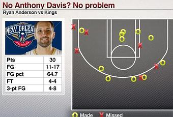No Anthony Davis, no problem per i Pelicans! NOLA viene presa per mano da Ryan Anderson, il protagonista assoluto della notte. Il tiratore bianco chiude con 36 punti (13 su 25 dal campo, 5 su 11 da tre) e stabilisce il suo career high per punti in un quarto, 18 (nel primo), e il record di franchigia per punti nel primo tempo, 30.
