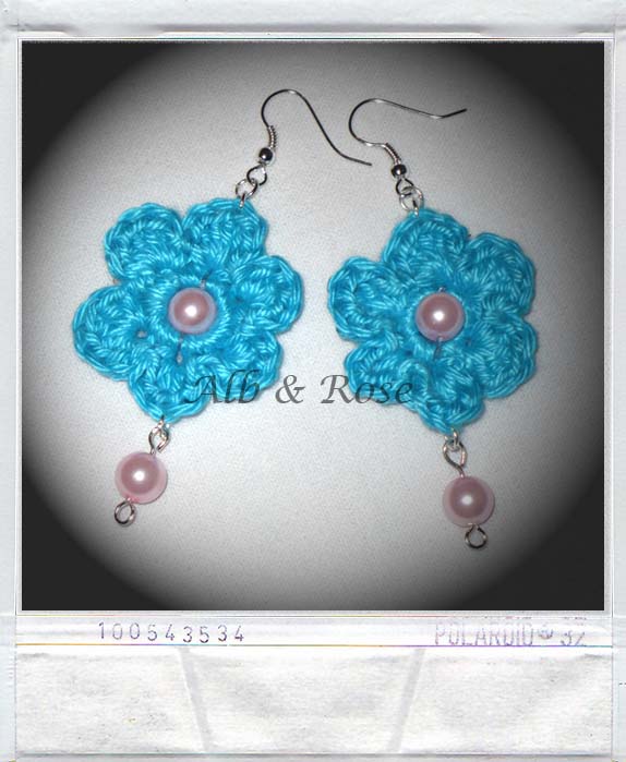 orecchini a lobo con importante fiore all'uncinetto colore AZZURRO e perla cerata di colore rosa; perno e farfallina in metallo argenteo nichel free. 1 paio disponibile. 3,00 €