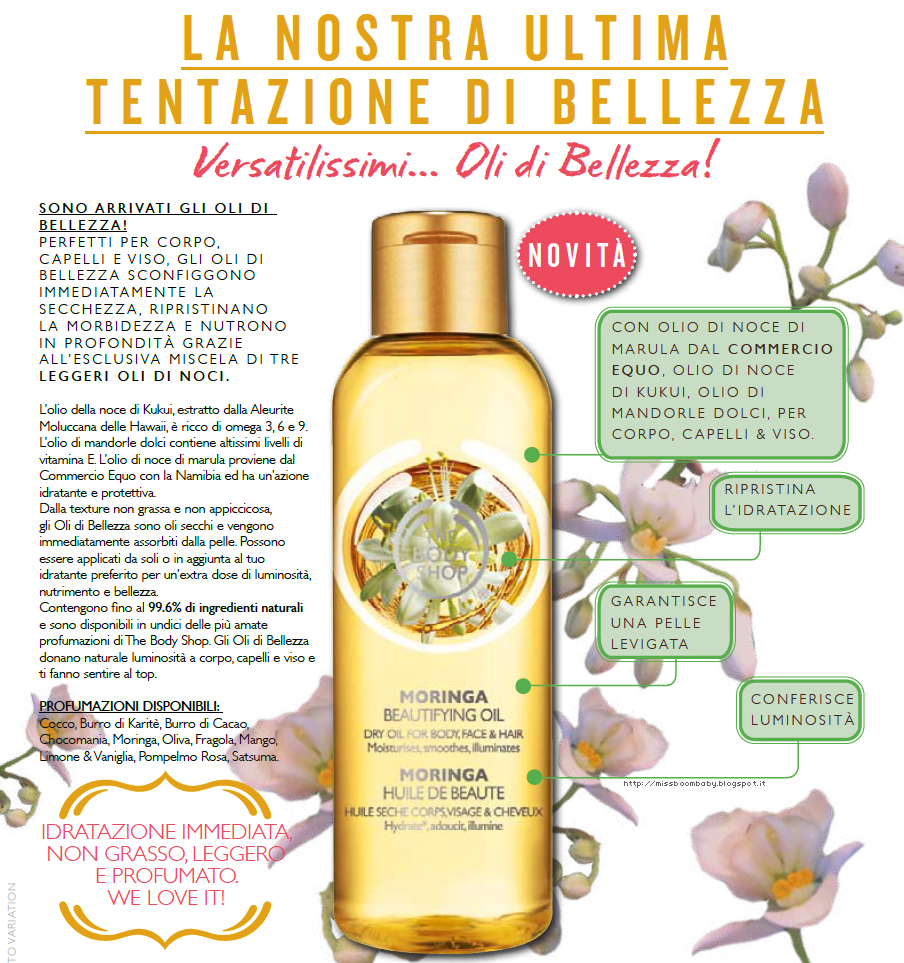 Novità da The Body Shop: gli oli di bellezza, i nuovissimi must have della stagione. Disponibili in tante profumazioni intriganti e golose. Con il 99,6% di ingredienti naturali questi oli promettono un'idratazione immediata e sono ideali per l'estate grazie ad una texture non grassa e di facile assorbimento. Può essere utilizzato su tutto il corpo, viso e capelli compresi, basta pochissimo prodotto per volta.