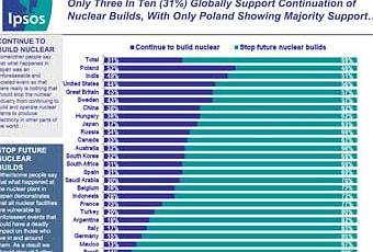 La ricerca dice che il sostegno al nucleare come fonte di energia elettrica è di gran lunga inferiore a quello per l’energia solare (97 %), eolica (93%), idroelettrica (91 %) e gas naturale (80 %). Solo un cittadino su quattro (adulti 38 %) in 24 paesi dice di essere a favore dell’energia nucleare. Le centrali atomiche piacciono a indiani (61 %), polacchi (57 %) e statunitensi (52 %). I cittadini britannici sono a metà: il 48 % a favore e il 51 % contro.