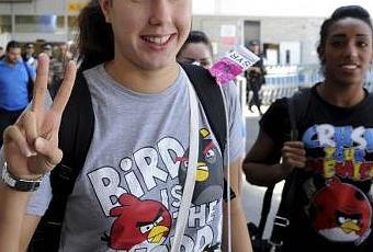 Atlete della nazionale siriana di nuoto che sbarcano a Londra con le magliette di Angry Birds...ci piace!