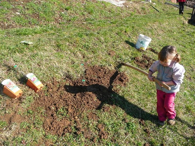 La scelta è caduta sul Ribes rosso, Ribes nero e Uva spina rossa. Dovevamo porre un freno alle continue razzie di Valentina all'orto del vicino sprovvisto delle reti di protezione anti-bambini golosi e famelici!! Scherzi a parte questi piccoli frutti piacciono tanto anche alla sottoscritta. Di questi piccoli frutticini sono ben note le loro proprietà benefiche: ricchi di vitamina A, tipica di ortaggi e frutta di colore rosso, vitamina C ed una fonte di naturale di antiossidanti. Il ribes nero (Ribes nigrum) in particolare viene usato anche come antiinfiammatorio ed antistaminico naturale nelle allergia di stagione. Lo uso anche io: si prende in gocce. Non penso che già quest'anno riusciremo a mangiarne sopperiremo con le fragole e i lamponi che già ci regalano delle belle scorpacciate.Con la mia aiutante preferita ho preparato il terreno: delle belle buche fonde circa 30-40 cm , concimando con il nostro compost (tutto di origine vegetale) e ho trapiantato le piantine ad una distanza di circa 1.5mt l'una dall'altra.A sostegno ho messo per ognuna un bel palo di castagno (gentilmente preparati da Christian) e le ho recintate singolarmente con una rete a protezione di animale perche lo scorso anno "qualcuno" si è venuto ad affilato le unghiette su di un pero appena piantato trappandone tutti i germogli alla base.