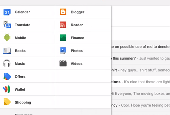 Il menu si origina dal logo Google, in alto a sinistra. Al passaggio del mouse si visualizzano, attraverso un sistema a discesa, le voci principali rappresentate dai servizi più popolari: Gmail, Images, Maps, YouTube, etc, compaiono nelle righe del menu, mentre il “More” permette di visualizzare gli altri servizi (Books, Shopping, Translate, etc.) in uno slide laterale. L’area dedicata al social resta più o meno invariata: stessa posizione, in alto a sinistra, struttura simile con area delle notifiche, foto del profilo e “Share” per condivide i contenuti.