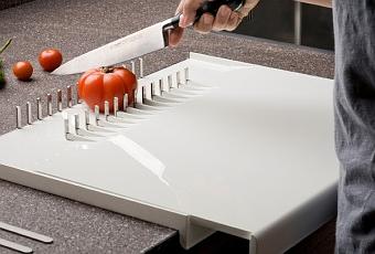Il prototipo è stato realizzato dalla ditta lodigiana Snips, specializzata nella produzione di oggetti per la cucina e casalinghi. Pensato anche come sistema di sicurezza per il taglio del cibo, questo tagliere sfrutta comportamenti allo stato latente che aprono l’utenza a più categorie, dai più giovani ai più anziani. Sono infatti i princìpi che il progetto stesso rispetta a porlo in una condizione di applicazione universale: dall’uguaglianza di utilizzo alla flessibilità d’uso, dalla semplicità e intuitività all’eccezionale percettibilità dell’informazione necessaria all’utente, dalla minimizzazione dei rischi accidentali alla riduzione dello sforzo fisico necessario al funzionamento, sino alle opportune valutazioni in termini di dimensioni e spazi sia per l’approccio sia per l’uso dello strumento. Tutto concorre alla massimizzazione dell’obiettivo primario, creare un oggetto utile e sicuro per tutti.