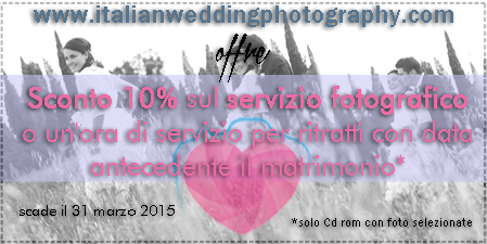Per tutti i futuri Sposi arriva un nuovissimo Wedding Coupon offerto dallo Staff di Italian Wedding Photography, che vi darà l'opportunità di scegliere fra uno Sconto del 10% sul vostro servizio fotografico di matrimonio o un'ora di servizio da dedicare interamente ai vostri ritratti, nel periodo precedente al matrimonio.