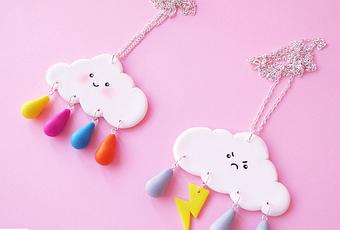 Dopo aver realizzato la forma e i fori per le gocce, si può montare e far diventare una collana o un porta chiavi. La nuvoletta felice ha delle gocce di arcobaleno pendenti, mentre quella arrabbiata ha delle gocce e un fulmine.