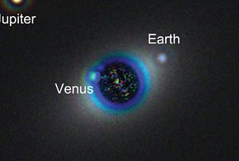 Simulazione di un sistema solare gemello al nostro ad una distanza di 13,5 parsec visto con HDST (telescopio spaziale di 12 metri di diametro) e un coronografo che viene a nascondere la luce della stella per poter evidenziare i pianeti (Venere, Terra e Giove).Crediti: L. Pueyo, M. N’Diaye. Pagina 43 di From Cosmic Birth to Living Earths, AURA.