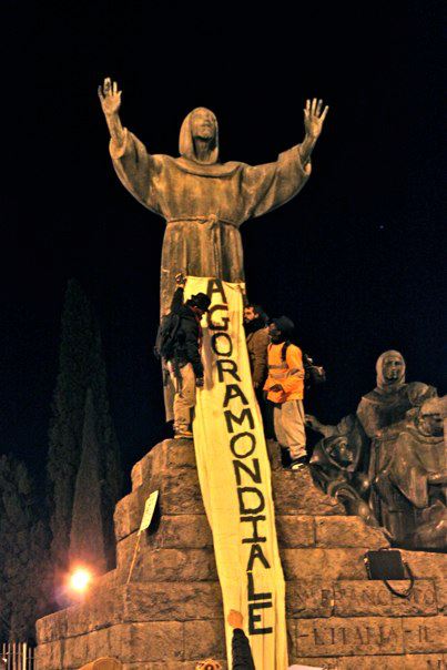 In tutti i Paesi del mondo le piazze sono state teatro di assemblee popolari e accampate. Piazza S.Pietro non sfugge a questo movimento di riappropriazione dello spazio pubblico. Coscienti del valore simbolico di un'azione in questo luogo sacro, i partecipanti dell'Agora Internazionale di Roma sono venuti a rimettere in questione il potere dello Stato Vaticano. In particolar modo hanno denunciato la Banca vaticana, IOR, e l'esenzione dalle imposte e tasse immobiliari di cui beneficia la Chiesa, visto che recentemente gli italiani si sono visti imporre di nuovo la vecchia ICI.