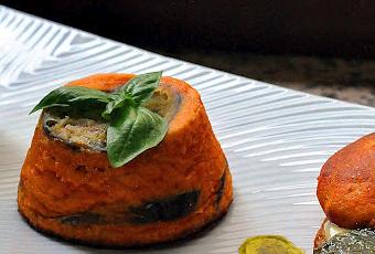 Per Prima cosa accendere il forno a 250°C. Dopodichè tagliare la melanzana lavata, senza togliere la buccia, e metterla sotto sale per circa 15 minuti. Nel frattempo tagliare la cipolla, metterla in un pentolino con olio evo, e lasciarla appassire per qualche minuto, poi aggiungere il pomodoro, sale, e cuocere la salsa per circa 10 - 15 minuti, fin quando si è rappresa bene e lasciare raffreddare. Cosi sbattere un uovo, con un pizzico di sale, e parmigiano, in una ciotola, e quando il sugo sarà freddo, aggiungere il pomodoro nell'uovo, mescolare bene, poi aggiungere la farina, e qualche fogliolina di basilico. Mentre il sugo riposa, laviamo le melanzane, strizziamole, infariniamole, e friggiamo in olio evo bollente. A questo punto, affettiamo il fiordilatte e iniziamo a creare il tortino. Prendiamo uno stampino, ungiamolo con dell'olio evo, e infariniamelo, quindi mettere il primo strato di pomodoro, poi melanzana, poi fiordilatte, altro pomodoro, parmigiano, e cosi via fino a fare due o tre strati. Quindi infornare per circa 15 minuti.