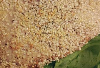 In una padella scaldate un paio di cucchiai di olio con uno spicchio di aglio, che poi toglierete successivamente. Nel frattempo preparate il tonno passandolo nel sesamo come se lo doveste impanarlo. Quando l'olio sara' caldo disponete i tranci sulla padella. Sono necessari pochi minuti per lato. Aggiungete sale e pepe e ultimate la cottura fino a quando non avranno acquisito un colore dorato.