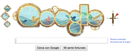 Ventimila Leghe Sotto i Mari è il titolo a cui fa riferimento il Doodle di oggi e che ha ispirato Google nell'omaggiare e celebrare il famosissimo autore francese di storie per ragazzi e di romanzi scientifici diventato il padre putativo per eccellenza della fantascienza moderna.Le sei lettere che costituiscono il nome del motore di ricerca si trasformano per un giorno in misteriosi oblò (forse quelli del sottomarino Nautilus?) comandabili con una levetta che permetteno di sbirciare il mondo sotterraneo, immaginifico, fantasioso e sommerso creato dalla straordinaria immaginazione di Verne stesso. Cliccando sopra il Doodle, invece, si viene catapultati nella ricerca vera e propria sullo scrittore. Il popolo di Internet potrà quindi navigare e esplorare il web per ventiquattro ore passando attraverso le sue meraviglie - insieme ai suoi terribili mostri (la solita dualità del web) - insieme alle spoglie del mitico e intramontabile Capitano Nemo. Non mi rimane che augurarvi buona ricerca!Ps. Adoro i dettagli in cui si dilettano coloro che stanno dietro le quinte di Google!