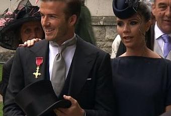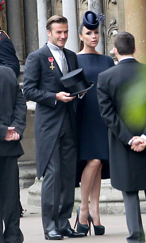 Lei, invece, l’unica e inconfondibile Victoria Beckham indossava un delizioso cappello di Philip Treacy e un abito blu notte, della sua linea d’abbigliamento, che a mio parere aveva uno scollo e un taglio magnifico.
