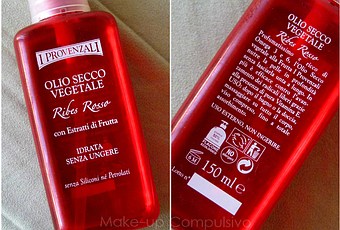 Ma la pianto di blaterare e vado al sodo.Quando ho partecipato al Tag L'ultimo arrivato vi ho mostrato alcuni acquisti recenti. In mezzo a quelli c'era anche l'olio secco vegetale al ribes rosso de I Provenzali. Alcune di voi ne sono rimaste incuriosite, mi avete chiesto di scrivere i miei pensieri al riguardo ed eccomi qui.