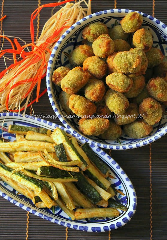 Ci togliamo lo sfizio in una volta sola e poi non se ne parla più per altri mesi! Quindi ho fritto le olive, poi delle polpettine fatte del loro ripieno che era avanzato e anche delle buonissime zucchine a bastoncino di cui mon amour va pazzo e che io preferisco quasi (e ho detto quasi) alle patatine fritte!