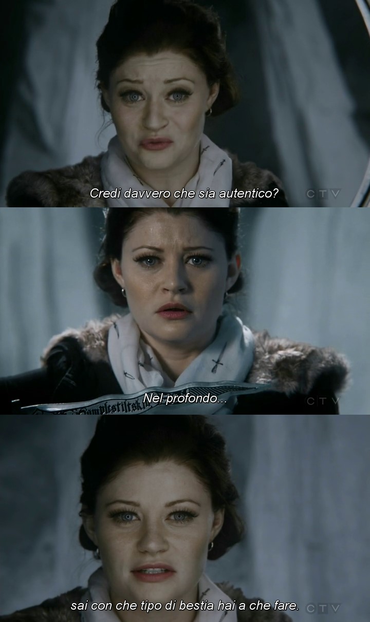 Nonostante Anna sia a volte un po’ ingenua nella sua semplicità, per una volta nota una cosa giusta. Questa sconosciuta che sbuca fuori al momento giusto, che dice di essere una parente sperduta, è veramente chi dice di essere? Peccato per lei che è ancora più malvagia di quanto non sospettasse, devo dire che quando Anna cade dal dirupo per svariati minuti l’ho data per morta, con tanto di insulti interiori a Once per avermi rovinato uno dei migliori film d’animazione degli ultimi anni.REGINA