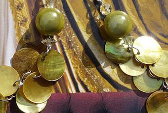 Orecchini con cascata di zecchini in madreperla verde e perla tonda magica 3d nella stessa nuance con piccoli cristalli verde più chiaro; gancio a monachella semplice chiusa