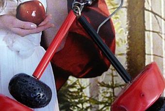 Orecchini asimmetrici che giocano tra il rosso del corallo, e del tubicino in vetro, e il nero dell’altro tubo e delle rondelle in pietra lavica; gancio ad amo nero