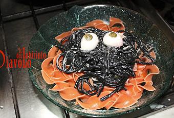 - Prendete i piatti e dividete sui fondi la pasta rossa e conditela con un filo d' olio e un po' di pepe, poi sopra accomodateci un nodo di capelli di strega;