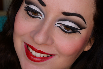 E' un trucco minimal, poco elaborato: palpebra bianca (matita Chromagraphic pencil White e ombretto Inglot 373) e il mio solito eyeliner creato con acqua e ombretto nero frantumato che ho utilizzato anche nel crease, sfumandolo poi con dell'ombretto nero. Un contouring vistoso (con tanta terra e Frankly Scarlet di Mac come blush) e sulle labbra un rosso vivo (F-Bomb di Urban Decay)