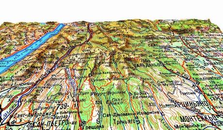 Facendo seguito al post di ieri ecco che vi metto un mio ritaglio (quadrato rosso) in 3D (sotto) - relativo alla Lessinia - della carta topografica sovietica in scala 1:500.000. Con un po di attenzione, anche senza conoscere il cirillico, sarete in grado di leggere Bosco Chiesanuova, Cerro Veronese, Grezzana...