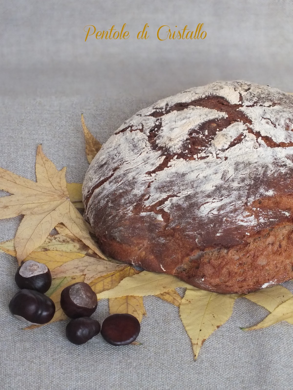 21 cucchiai di farina Manitoba6 cucchiai di farina di castagne100 g di lievito madre secco500 ml di acqua tiepidaun cucchiaio raso di sale250 g di pinoli150g di casta bolliterosmarino