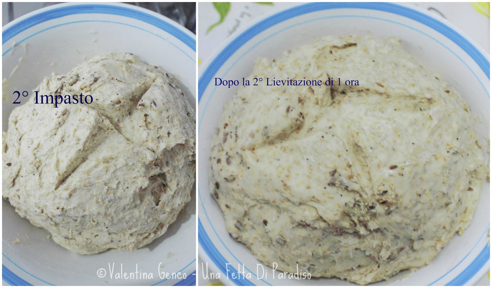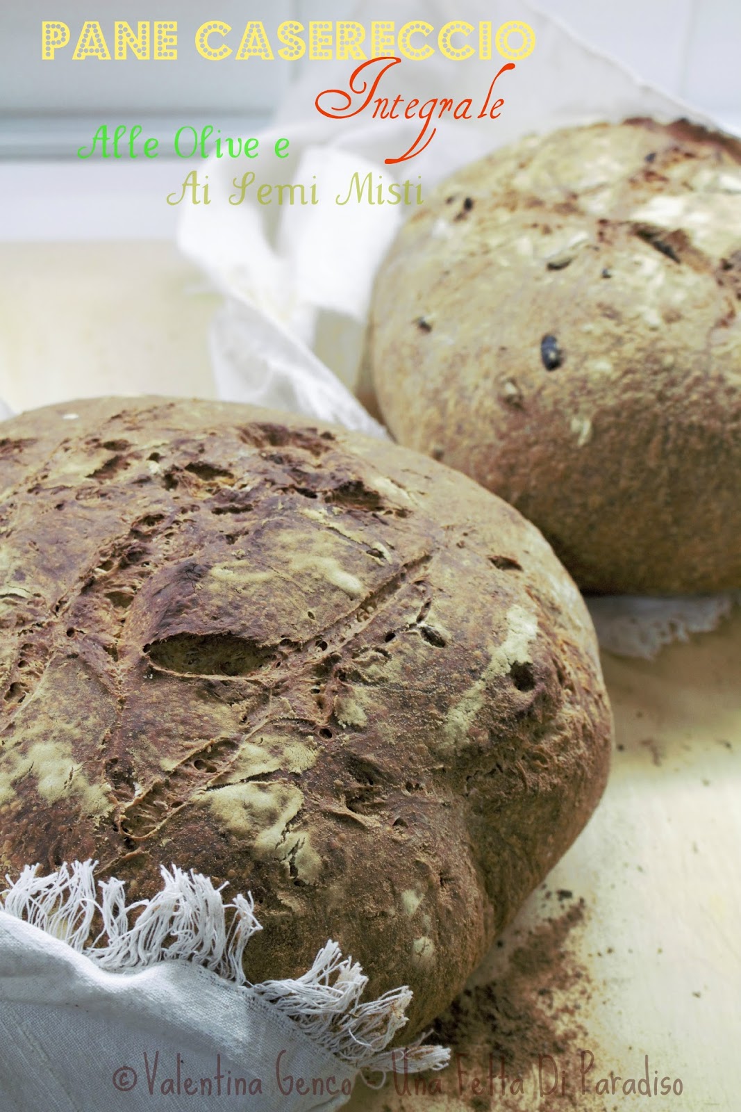 150 gr farina Manitoba150 gr farina di frumento integrale66 gr lievito madre secco300 ml acqua naturaleProcedimento 1° Impasto:Con l'aiuto della planetaria unisco gli ingredienti e con il gancio a spirale impasto finché tutti gli ingredienti formino una palla soda.Faccio lievitare, poi, coperto nel forno spento per 2 ore.N.B. Ho impastato due lievitini distinti, perché in uno ci ho poi aggiunto le olive miste e nell'altro i semi misti, creando così 2 pagnotte.Nel recipiente blu c'è la versione alle olive. Ingredienti Per Impasto Da 1,6 kg cada uno:lievitino di cui sopra300 gr acqua + 50 gr acqua a temperatura ambiente700 gr farina (di cui 350 gr di farro integrale, 100 gr integrale di frumento, 200 gr Manitoba)100 gr olive miste tagliate a rondelle(nell'altra pagnotta 60 gr semi misti per panificazione) 30 gr sale fino40 gr olio extra vergine di olivaProcedimento 2° Impasto:Sempre nella planetaria, ma potete procedere anche sul piano lavoro a mano, ho sciolto il lievitino lievitato con la prima parte dell'acqua naturale. Aggiungo le farine e le olive.Faccio riposare per 1 ora.Per la 2a pagnotta aggiungo invece i semi misti.Impasto di seguito nella ciotola aggiungendo la seconda parte di acqua e il sale, tirando i lembi dall'esterno verso il centro.Qui ho proceduto dentro il recipiente a mano.Aggiungo l'olio continuando ad impastare seguendo lo stesso procedimento dei lembi.Quando il panetto diventa sodo e liscio, lo lascio lievitare fino al triplo, coperto e in luogo tiepido (sempre nel forno spento) per circa 3 ore.Procedo allo stesso modo per la seconda pagnotta ai semi misti.Trascorse le 3 ore, riprendere ogni impasto, e fare delle serie da tre pieghe a libro, sul piano da lavoro.Foderare due colapasta con della carta da forno, cospargere di semola e mettere i panetti, ognuno dentro ad un scolapasta, lasciando lievitare in luogo tiepido per una notte intera (io circa per 15 ore). Il giorno seguente accendere il forno a 240°.Sulla teglia cospargere della semola.Ribaltare dal colapasta la forma del pane, incidere con una lama, infornare inserendo dei cubetti di ghiaccio in un tegamino all'interno del forno.Cuocere alla massima potenza per 30 minuti., poi abbassare la temperatura a 200° per i restanti 30 minuti.Negli ultimi 10 minuti, aprire lo sportello del forno ponendo nell'intercapedine un forchettone di legno.A fine cottura far raffreddare su una griglia, coperto da un telo di lino. Le info per la lavorazione e la lievitazione l'ho estrapolate da questo blog.